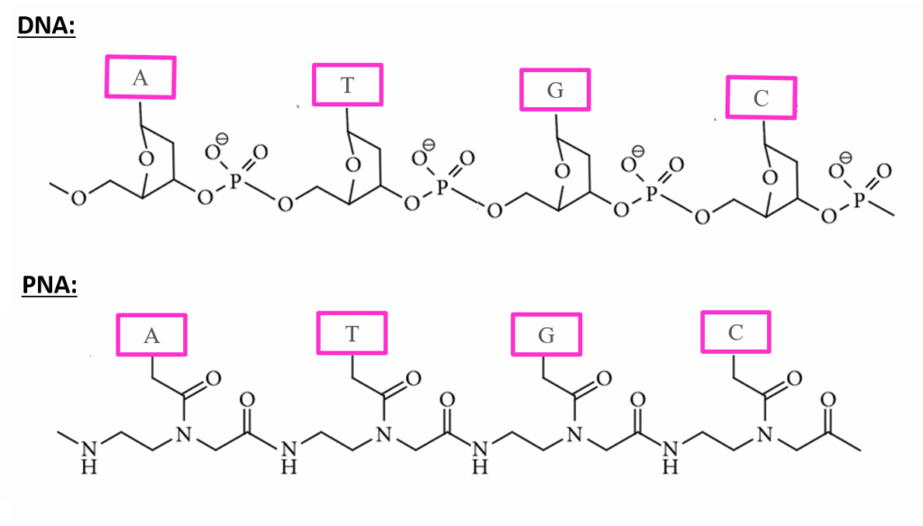 Peptide Nucleic Acid (PNA) is a synthetic analogue of DNA with a neutral peptide-like backbone made of N-(2-aminoethyl)glycine instead of sugar-phosphate units. This design gives PNA exceptional chemical and enzymatic stability, allowing it to remain intact inside cells. PNAs bind complementary DNA or RNA sequences with high affinity through Watson–Crick base pairing, forming thermally stable hybrids and triplex structures by strand invasion. Their robust stability and precise hybridization make PNAs powerful tools for molecular diagnostics and antisense therapeutic research.