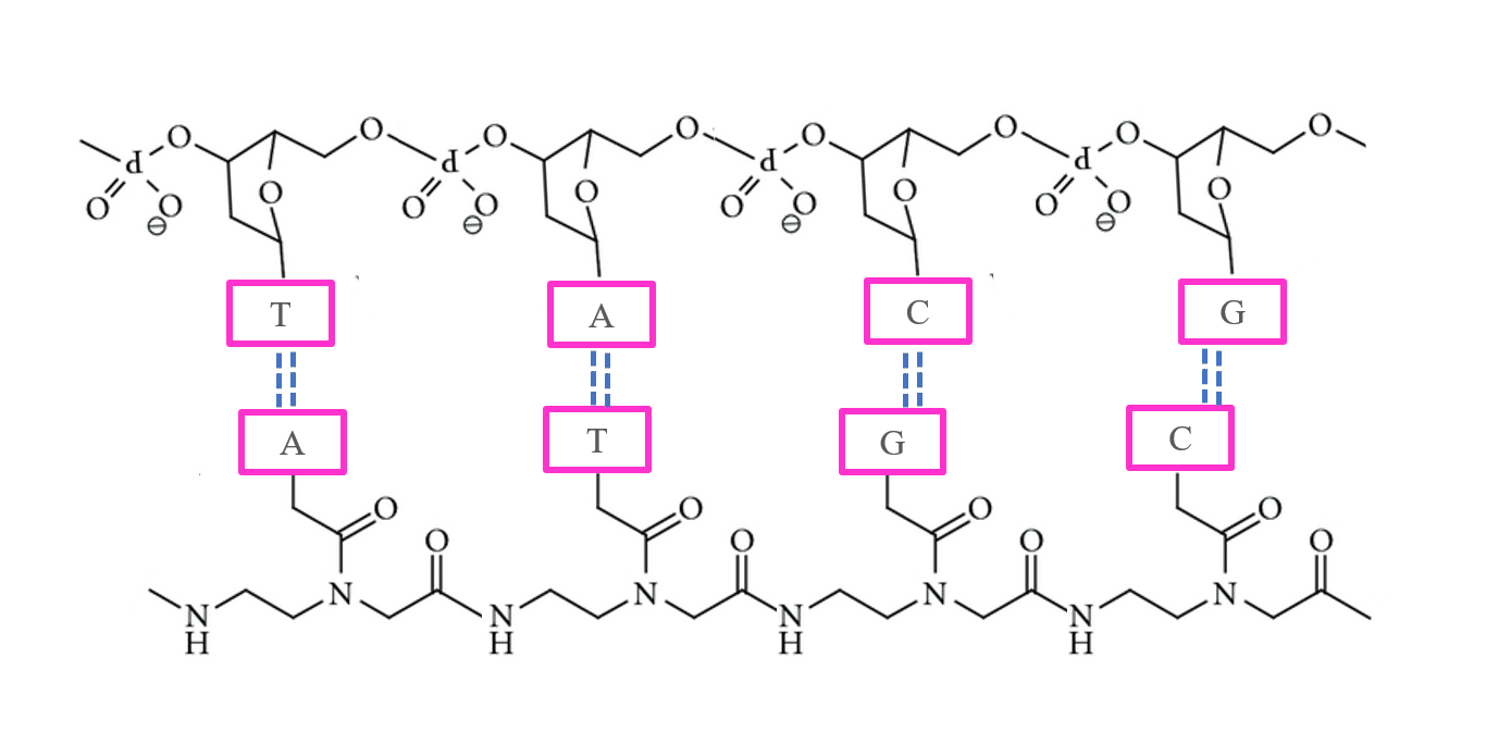 In peptide nucleic acids (PNAs), the usual phosphodiester backbone of DNA is substituted with repeating N-(2-aminoethyl)glycine units, to which purine and pyrimidine bases are attached through a methylene carbonyl linker.