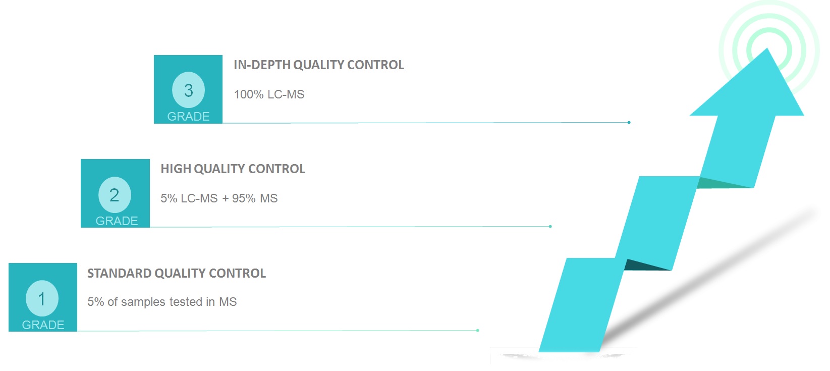 Our available quality control methods include MS (Mass Spectrometry) and LC-MS (Liquid Chromatography coupled to Mass Spectrometry). In addition to confirm the presence of the expected peptide sequence, LC-MS also determines the purity level of each synthesized peptide.